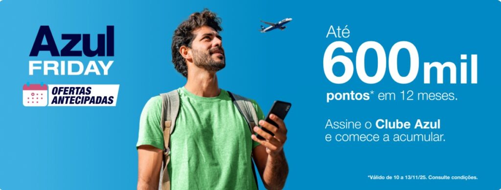 1. A Campanha é válida no período de 10/11/2025 às 09:00 até 13/11/2025 às 23:59, horário de Brasília, e serão considerados todos os participantes do “Programa de Fidelidade da Azul” que realizarem a adesão pelo link promocional durante o período da Campanha de Ofertas Antecipadas Azul Friday.
