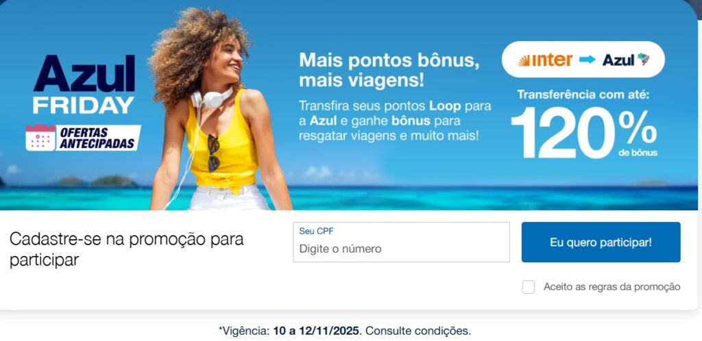 2. Para garantir o bônus, o cliente deve possuir cadastro no programa de fidelidade da Azul, com a conta em situação regular e cadastrar seu CPF no link da promoção https://www.voeazul.com.br/br/pt/ofertas/inter antes de realizar a transferência.