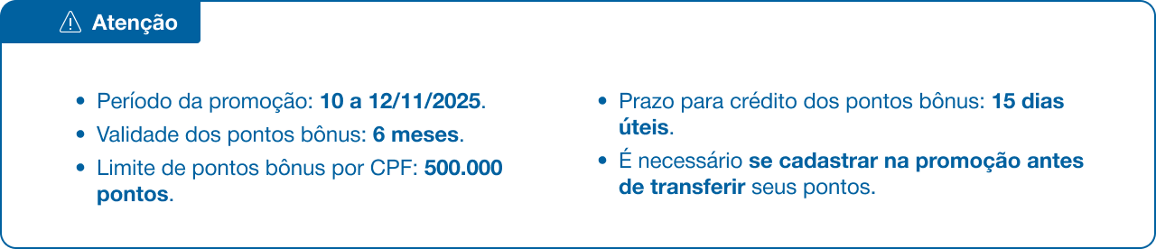 Acumule muitos pontos! Faça a transferência agora mesmo para aproveitar.