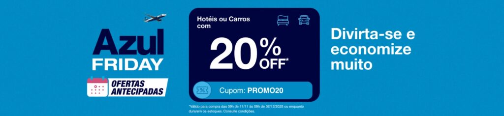 Você está correto! A Azul Viagens está com uma oferta de 20% de desconto em hotéis e carros como parte da sua Azul Friday, e esta promoção é válida somente 11/11 a 02/12/2025.