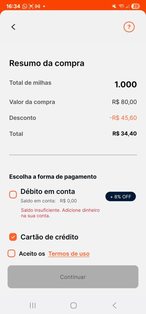 Escolha a quantidade de milhas que você quer comprar e clique em continuar.
