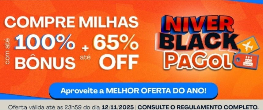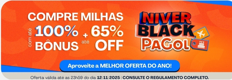 Participantes com assinatura ativa no Turbo Milhas recebem cupom de 57% de desconto em até 3x no cartão de crédito e adicional de 8% pagando com o débito em conta PaGol. Clique para acessar o regulamento completo.