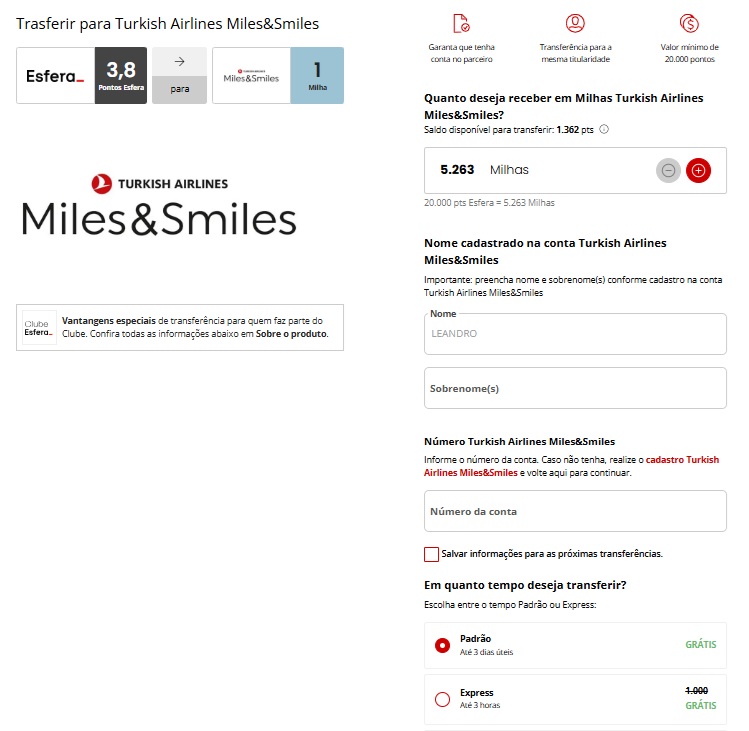 · Transferência mínima para o programa Turkish Airlines Miles&Smiles é de 30.000 pontos Esfera.