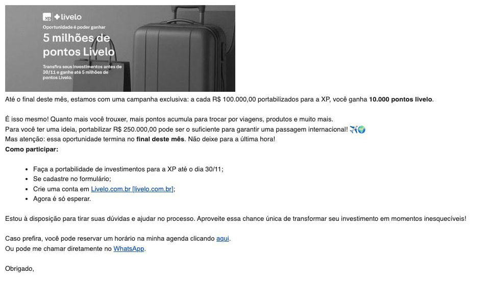 • A cada R$ 100 mil em investimentos portados para a XP, o cliente recebe 10 mil pontos Livelo.