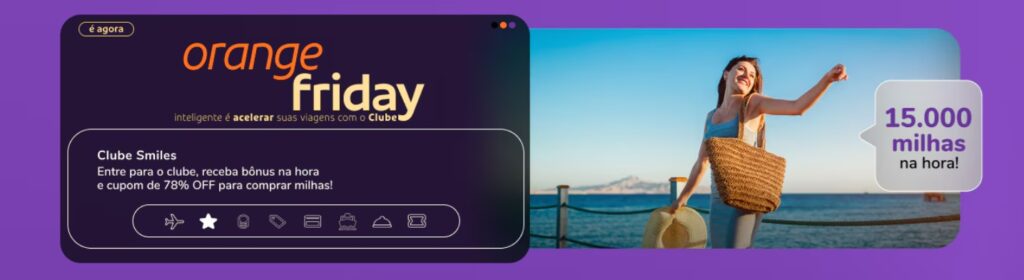 Assinando hoje o Plano 1.000 você garante 15 mil milhas na hora + um cupom de 78% OFF para comprar milhas! Assim você começa a Orange Friday com a conta turbinada! Vai perder essa chance? Assine já!