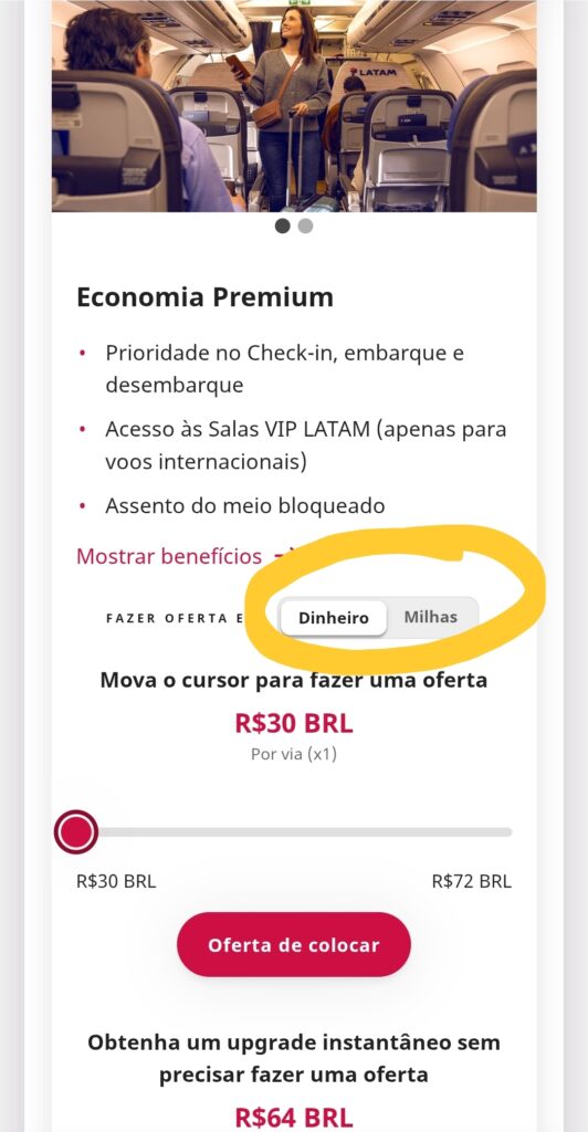 Participe oferecendo um valor! Você pode usar Dinheiro ou Milhas LATAM Pass. A cobrança só será realizada se o seu lance for aceito, e você pode cancelar o pedido até 12 horas antes do voo.