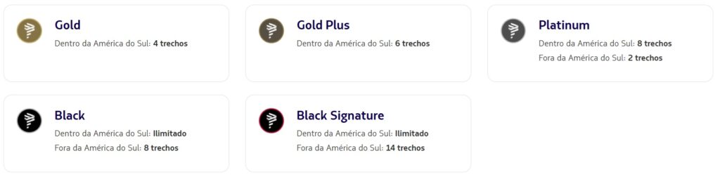De acordo com sua Categoria Elite, você terá uma quantidade de trechos de cortesia para solicitar upgrade em voos pela América do Sul e outra quantidade de trechos de cortesia para solicitar upgrade em voos fora da América do Sul. O uso de um não impacta o saldo do outro. Muito mais simples para você!