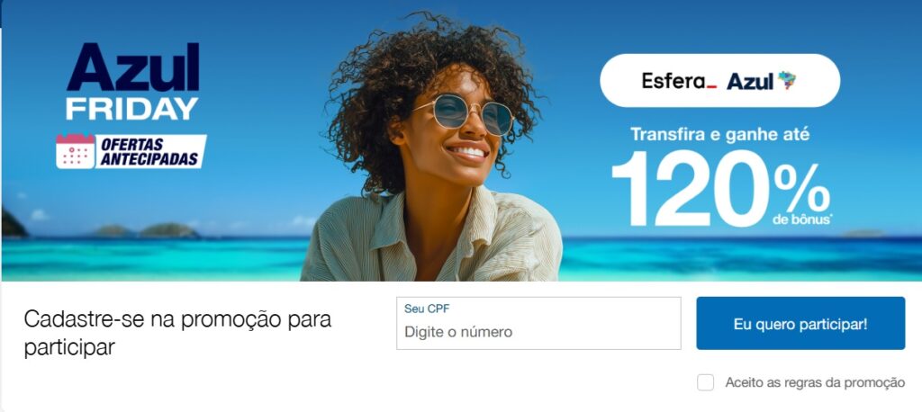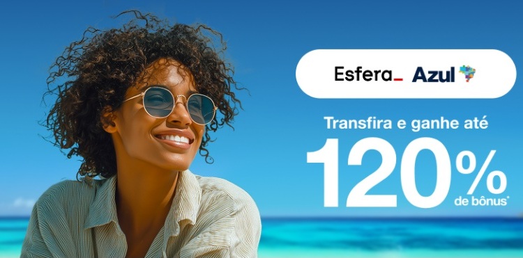 2. Para garantir o bônus, o cliente deve possuir cadastro no programa de fidelidade da Azul, com a conta em situação regular e cadastrar seu CPF no link da promoção https://www.voeazul.com.br/br/pt/ofertas/esfera antes de realizar a transferência.