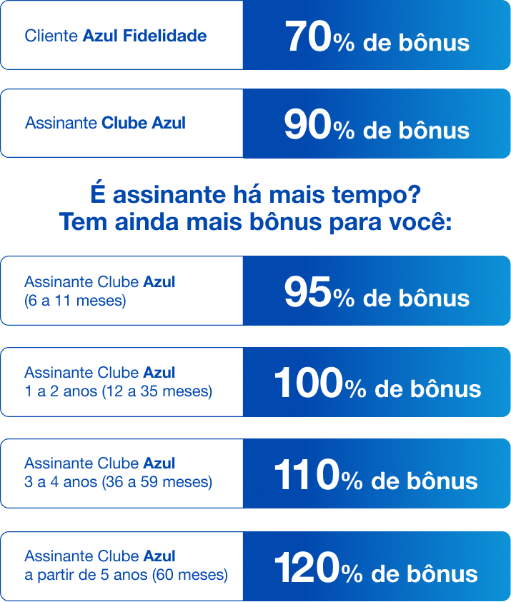 7.1. Bonificações para assinantes Clube Azul com adesão na data da transferência, poderão receber a bonificação pertinente ao produto em data diferente do restante do bônus.