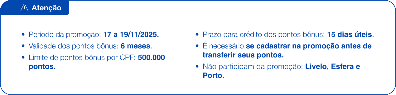 Após se cadastrar, transfira seus pontos até 19/11/2025.