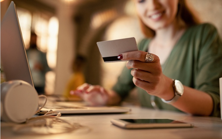 Close-up of female entrepreneur using laptop and credit card for online shopping while working late in the office.