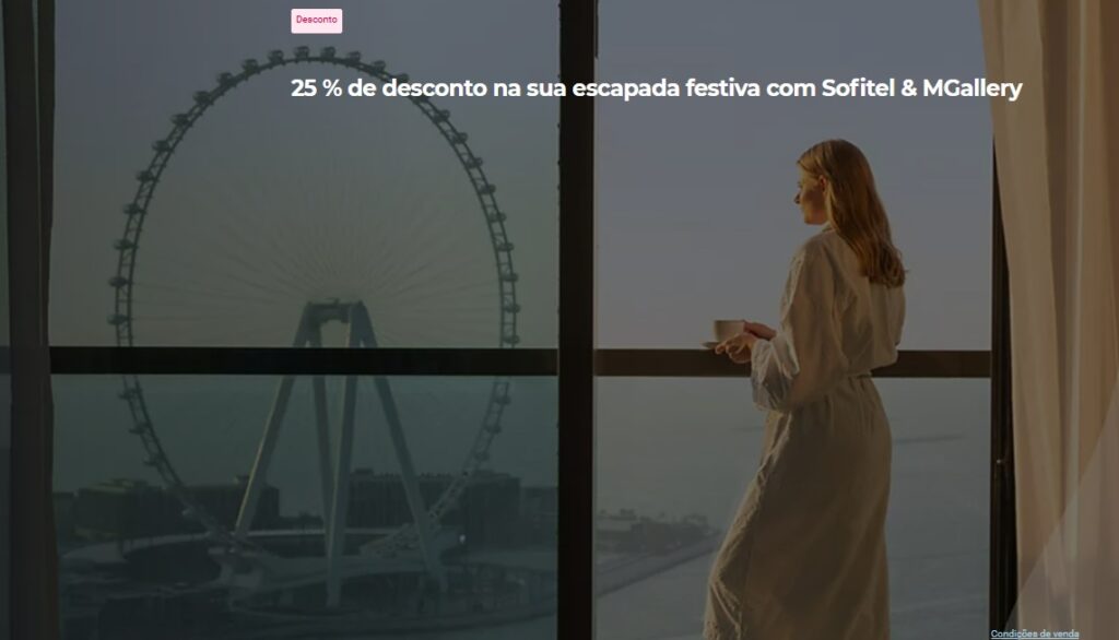 Esta oferta é válida, sujeita à disponibilidade no hotel selecionado, para estadias de 08 de dezembro de 2025 a 15 de março de 2026*, incluídas, em um dos hotéis participantes Sofitel Legend, Sofitel e MGallery (localizados em um dos seguintes países: Argélia, Argentina, Austrália, Áustria, Bahrein, Bélgica, Benin, Bósnia e Herzegovina, Brasil, Bulgária, Camboja, Canadá, Colômbia, Croácia, República Checa, Egito, Guiné Equatorial, Fiji, França, Polinésia Francesa, Alemanha, Grécia, Hungria, Índia, Indonésia, Israel, Itália, Costa do Marfim, Japão, Quênia, Coreia do Sul, Laos, Líbano, Luxemburgo, Malásia, Maurício, México, Moldávia, Marrocos, Myanmar, Países Baixos, Nova Zelândia, Panamá, Peru, Filipinas, Polônia, Catar, Arábia Saudita, Singapura, Espanha, Suíça, Tailândia, Turquia, Emirados Árabes Unidos, Reino Unido, Estados Unidos da América, Uruguai, Vietnã), e reservada entre 21 de outubro de 2025 e 01 de dezembro de 2025 às 23h59, hora de Paris (UTC+1).