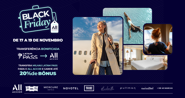 De 17 a 19 de novembro, sua Black Friday continua com mais pontos no ALL Accor! Transfira suas Milhas LATAM Pass e ganhe até 20% de bônus para usar em viagens, experiências e hospedagens pelo mundo. Confira os Termos e Condições.