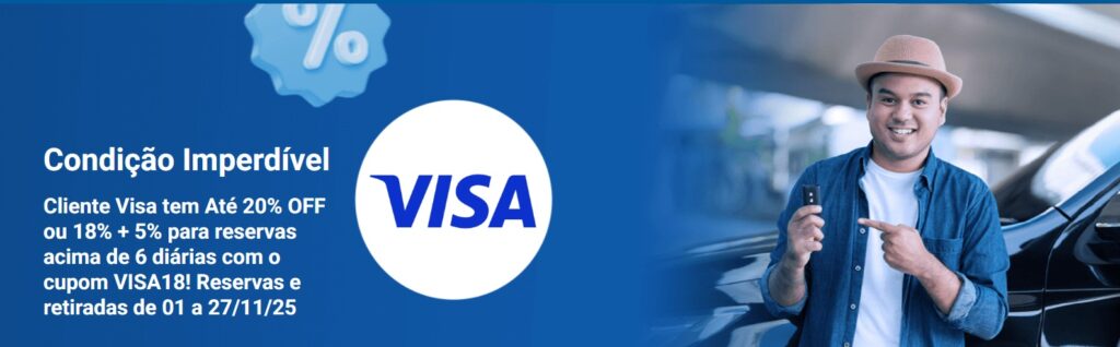 Cliente Visa tem Até 20% OFF ou 18% + 5% para reservas acima de 6 diárias com o cupom VISA18! Reservas e retiradas de 01 a 27/11/25