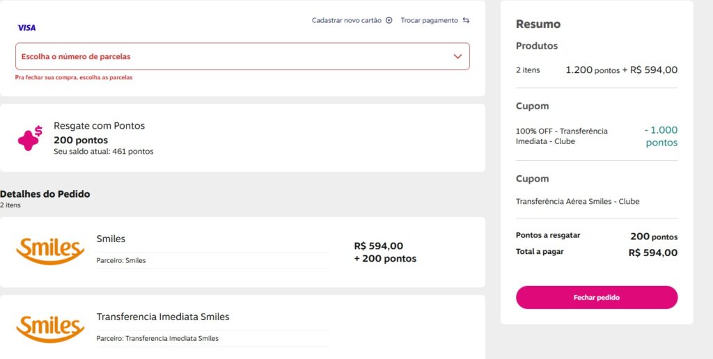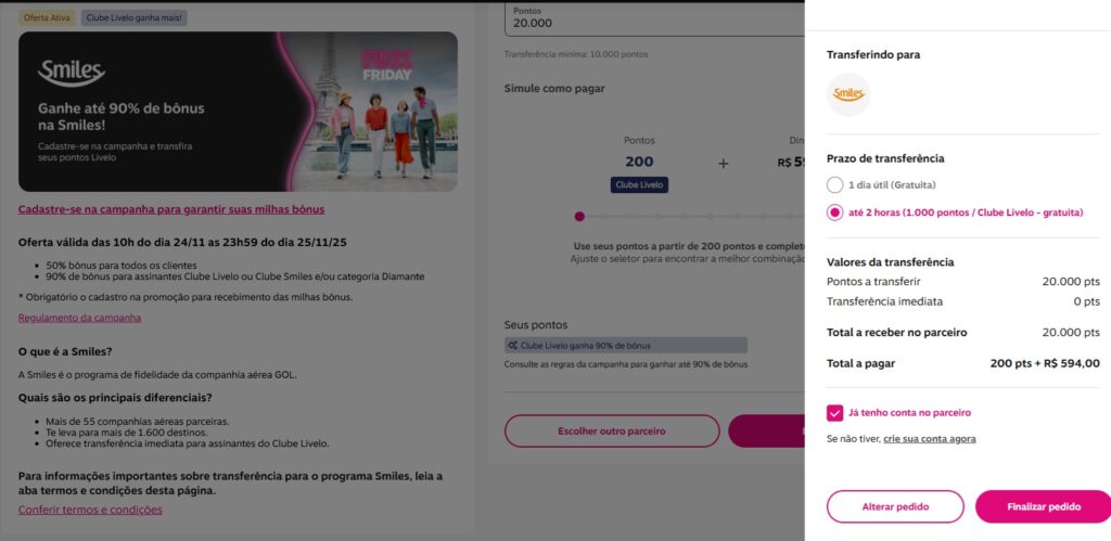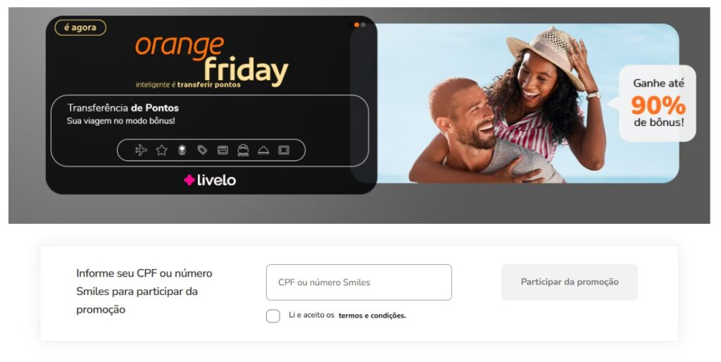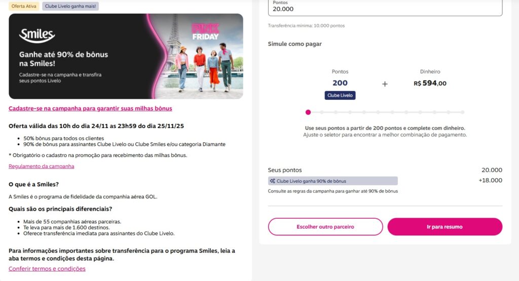- 90% de bônus para assinantes Clube Livelo ou Clube Smiles e/ou categoria Diamante
