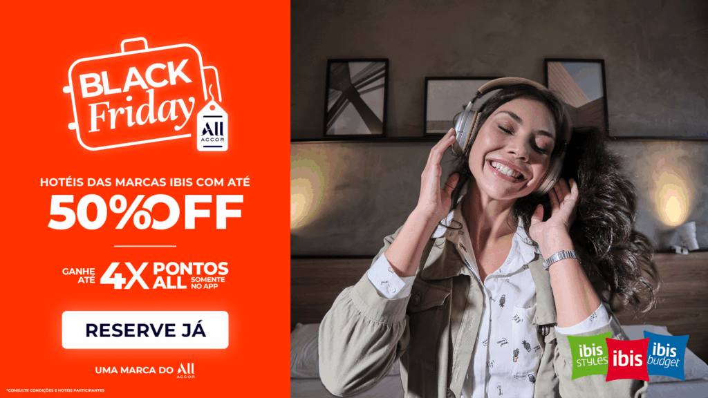 Aproveite até 50% de desconto* nos hotéis ibis durante a Black Friday 2025. Ao se cadastrar grátis no ALL Accor, você acumula até 4x pontos* Reward exclusivo no aplicativo.