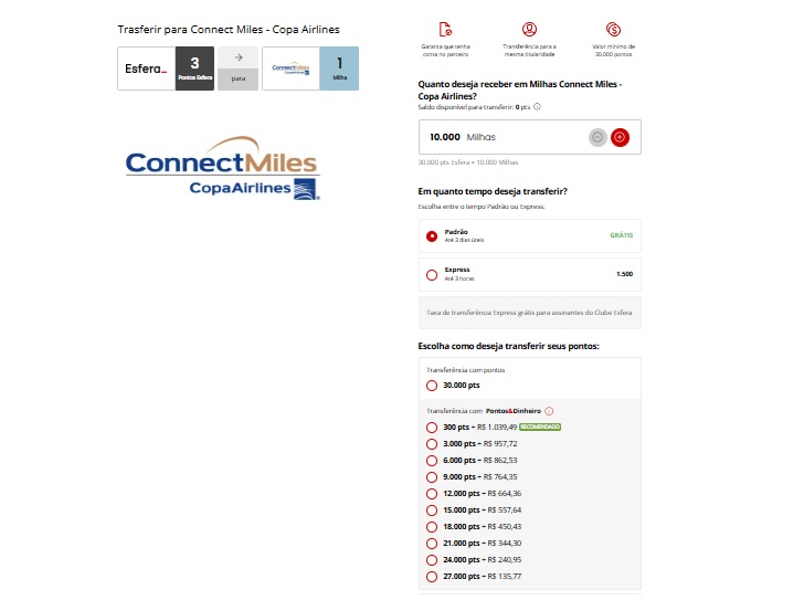 · Trocas válidas apenas entre contas Esfera e ConnectMiles de mesma titularidade.