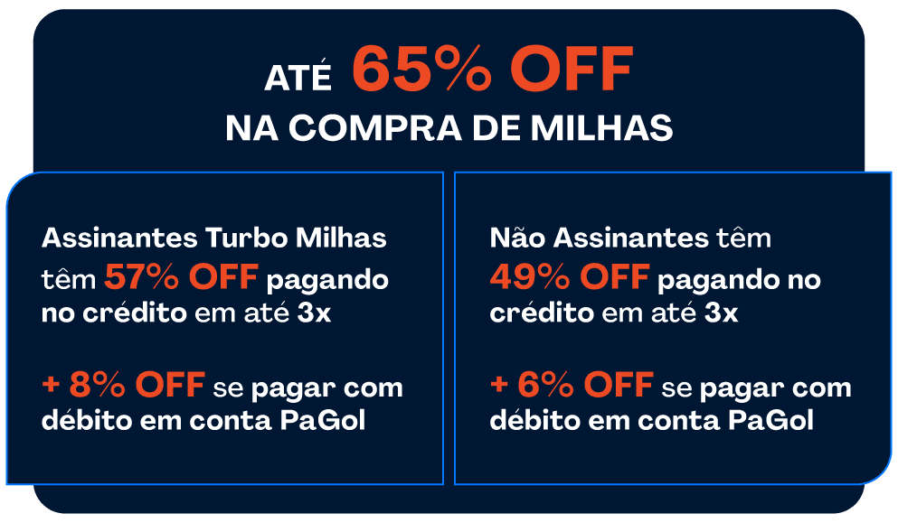 • Para garantir o maior desconto na oferta, o cliente precisa ser Assinante Turbo Milhas antes de realizar a compra e efetuar o pagamento com débito em conta PaGol.