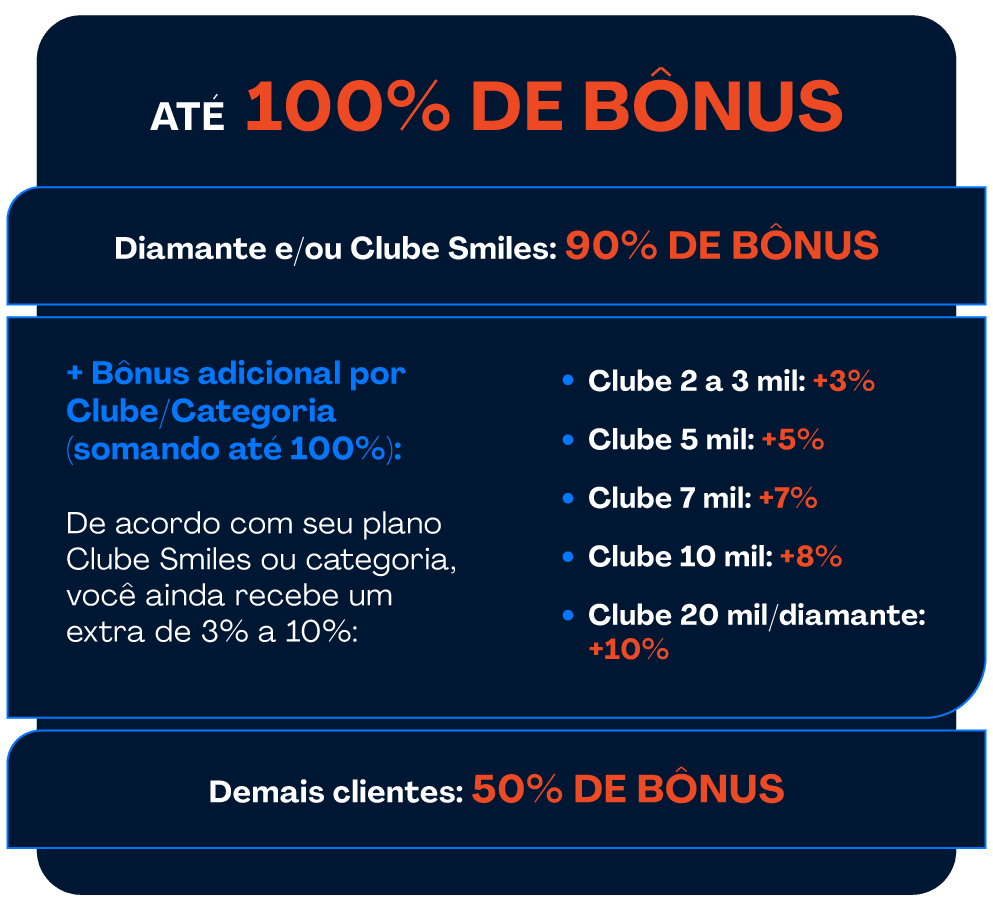 • Para garantir o maior bônus na oferta, o cliente precisa ser assinante Clube Smiles 20.000 ou categoria Diamante e se enquadrar nas faixas de bônus dado pelo Clube Smiles assinado antes de realizar a compra.