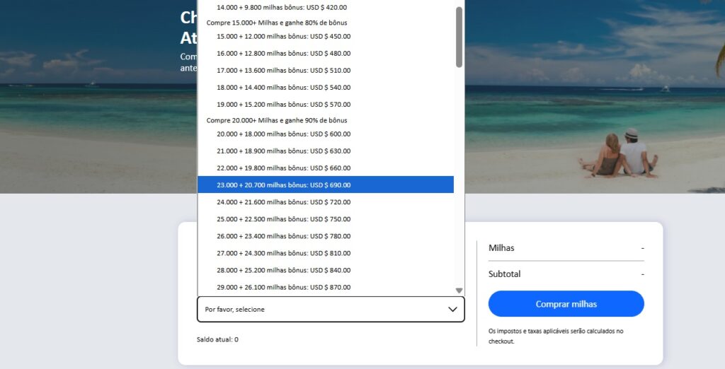 - É necessário atingir um valor mínimo de transação para se qualificar para a oferta. Para mais informações sobre o valor mínimo, visite a seção “quantas milhas pretende comprar?”