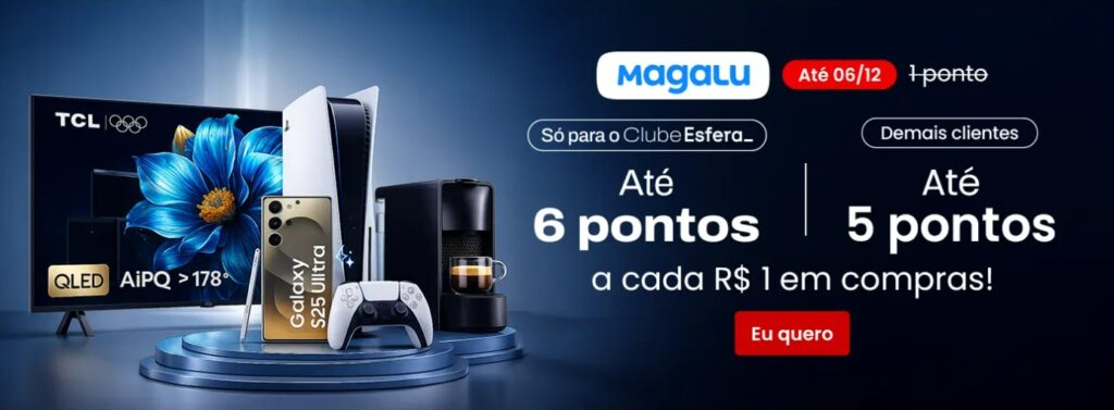 * Produtos vendidos e entregues pelo Magalu: 6 pontos a cada R$ 1,00 em compras para assinantes do Clube Esfera e 5 pontos a cada R$ 1,00 para demais clientes;
