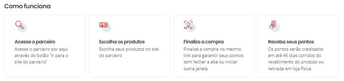 •    Para juntar pontos, acesse o hotsite através do botão “Ir para o site do parceiro”, escolha seus produtos e utilize as opções de pagamentos disponíveis no site.