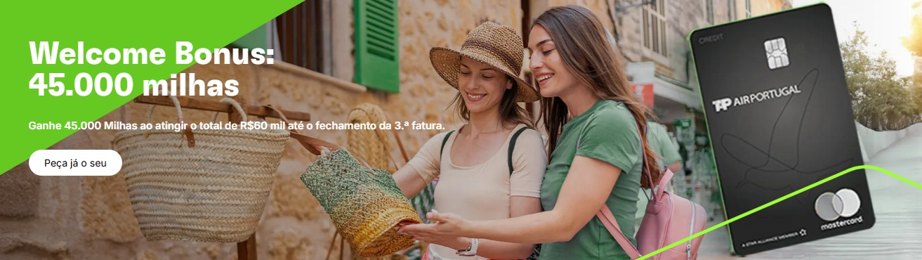 • Welcome Bonus: 45.000 milhas Com o Cartão de Crédito TAP BTG Pactual Black, ganhe um Welcome Bonus de 45.000 Milhas ao atingir o total de R$60 mil até o fechamento da 3.ª fatura. Confira o regulamento aqui.