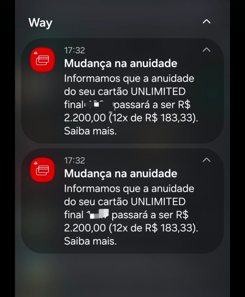 Uma péssima notícia acontece na data de hoje, 09/12. Os clientes do banco Santander estão recebendo notícias por e-mail e por SMS sobre a nova anuidade dos cartões Santander Unlimited em seu novo ciclo.