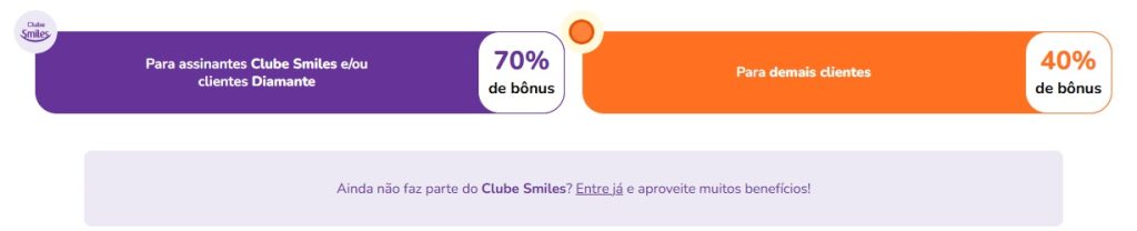 - Para ganhar o bônus máximo desta promoção, os clientes assinantes do Clube Smiles precisam estar com a assinatura ativa antes de realizar a transferência dos pontos para a Smiles no período da promoção;