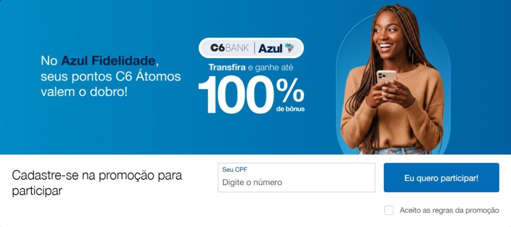 2.3 Para garantir o bônus, o cliente deve possuir cadastro no programa de fidelidade da Azul, com a conta em situação regular e também cadastrar seu CPF no link da promoção https://www.voeazul.com.br/br/pt/ofertas/c6 antes de realizar a transferência.