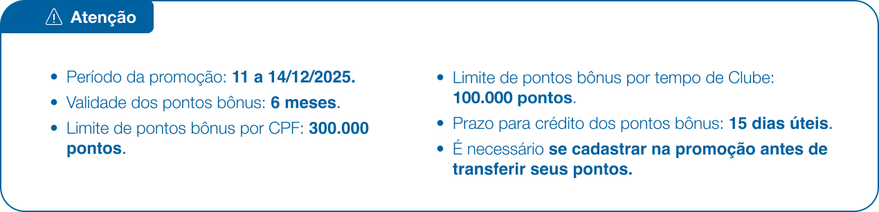 Transfira seus pontos até 14/12/2025.