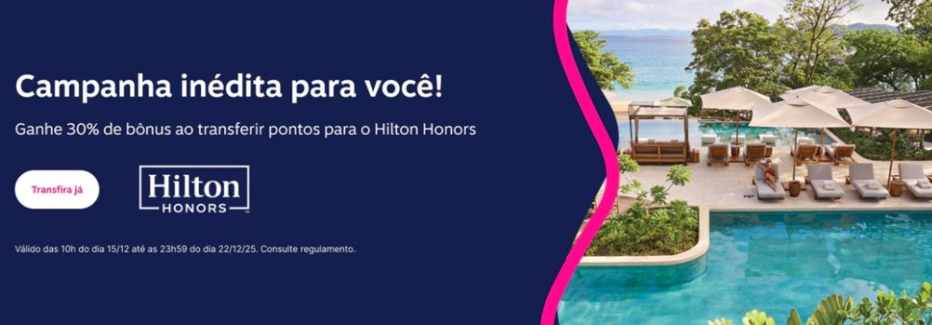 - creditados em até 48h após a transferência, com validade de 24 meses, contados do crédito no Hilton Honors. Sem limite de bonificação.