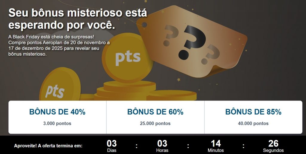 • Entre 25.000 e 35.000 pontos Aeroplan ganhará 60% de Pontos Bônus; e