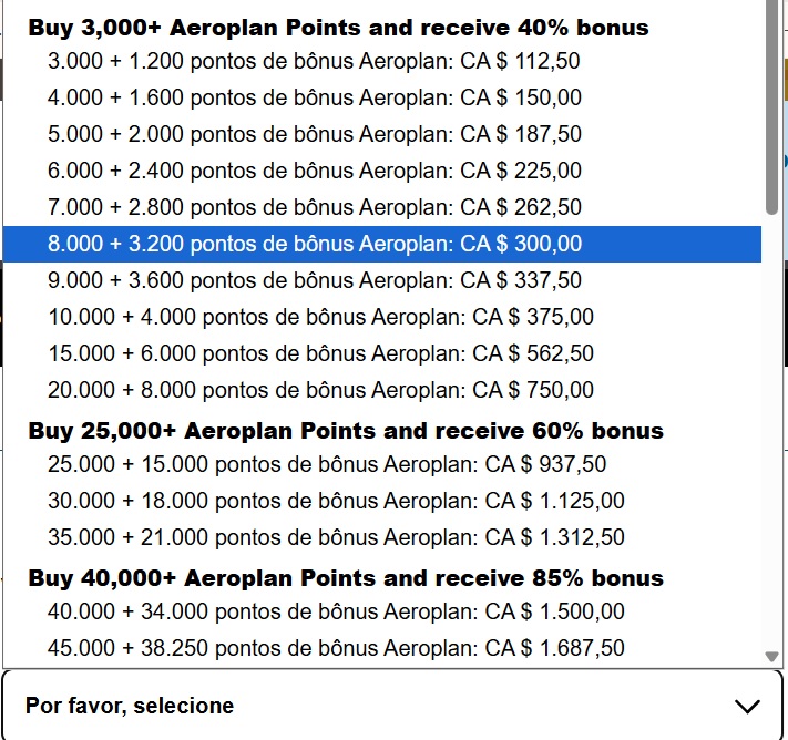 iv. Os pontos Aeroplan elegíveis contam para o limite anual de pontos Aeroplan que podem ser comprados por conta Aeroplan, que é de 1.000.000 pontos Aeroplan.