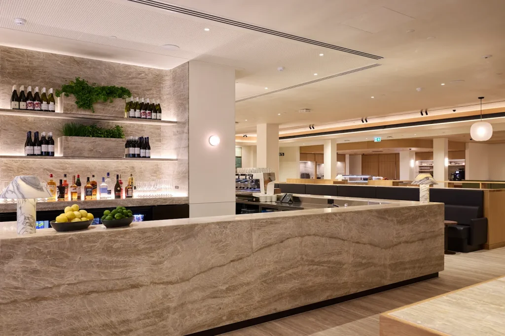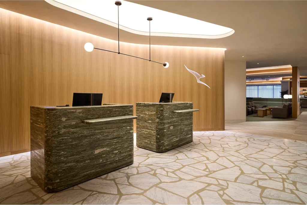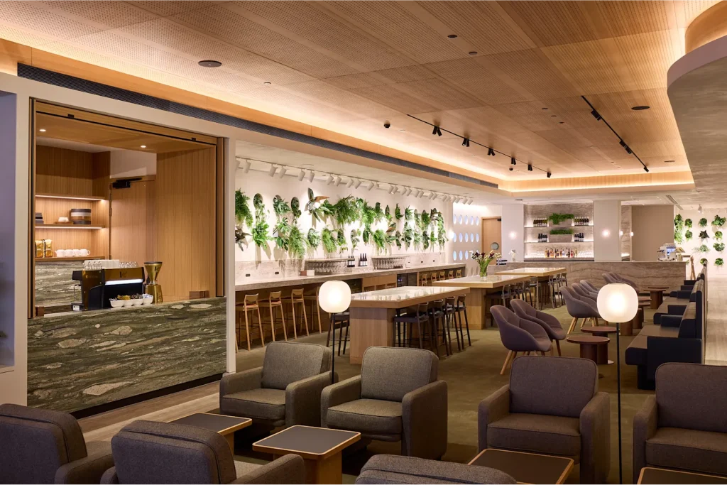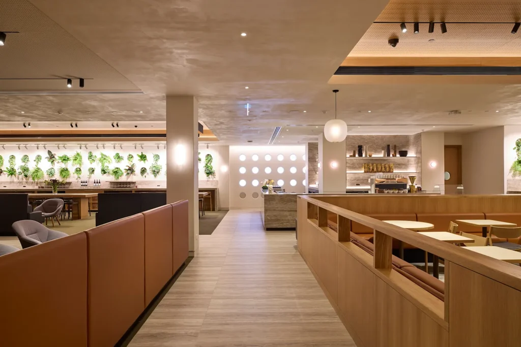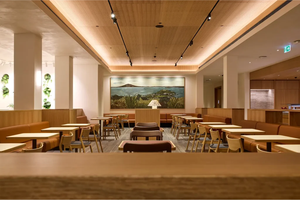 O novo lounge foi projetado para integrar elementos naturais e culturais da Nova Zelândia, criando um ambiente elegante e acolhedor.