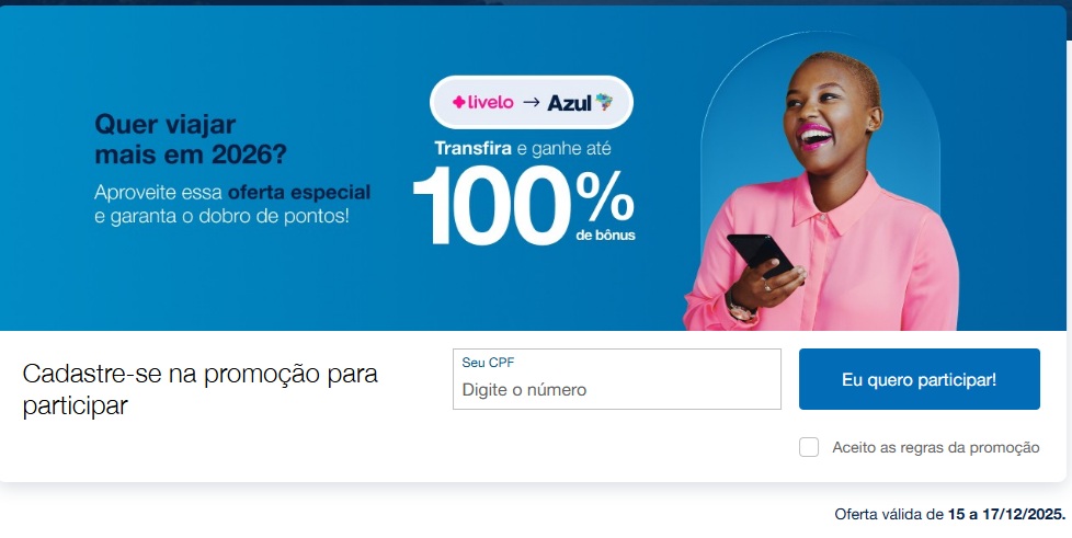 2.2. A partir de 01/04/2024 as transferências de todos os parceiros financeiros não geram mais pontos qualificáveis para as categorias do Azul Fidelidade. 2.3 Para garantir o bônus, o cliente deve possuir cadastro no programa de fidelidade da Azul, com a conta em situação regular e também cadastrar seu CPF no link da promoção https://www.voeazul.com.br/br/pt/ofertas/livelo antes de realizar a transferência.