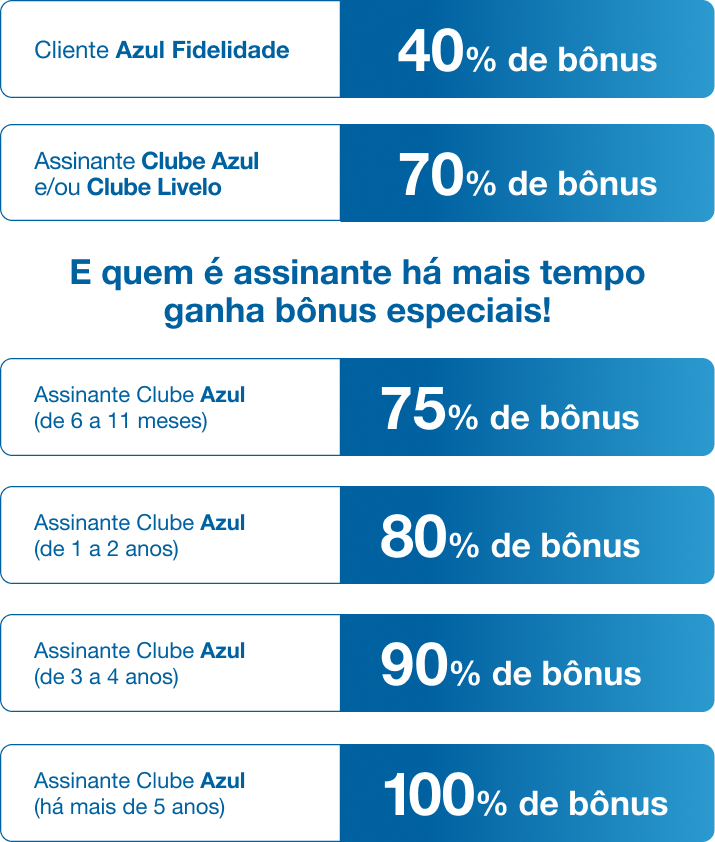 2. Para garantir o bônus, o cliente deve possuir cadastro no programa de fidelidade da Azul, com a conta em situação regular.