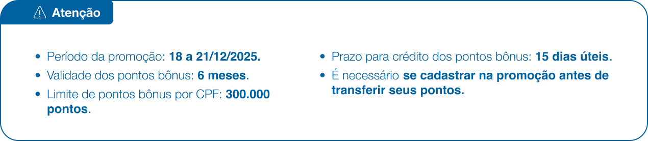 7. Os pontos bônus serão creditados em até 15 dias úteis após o término da campanha.