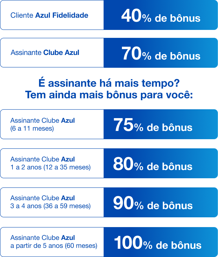 2. Para garantir o bônus, o cliente deve possuir cadastro no programa de fidelidade da Azul, com a conta em situação regular.