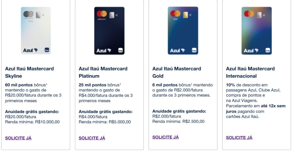 Os cartões Azul Itaú possuem pontuações diferentes para cada variante: