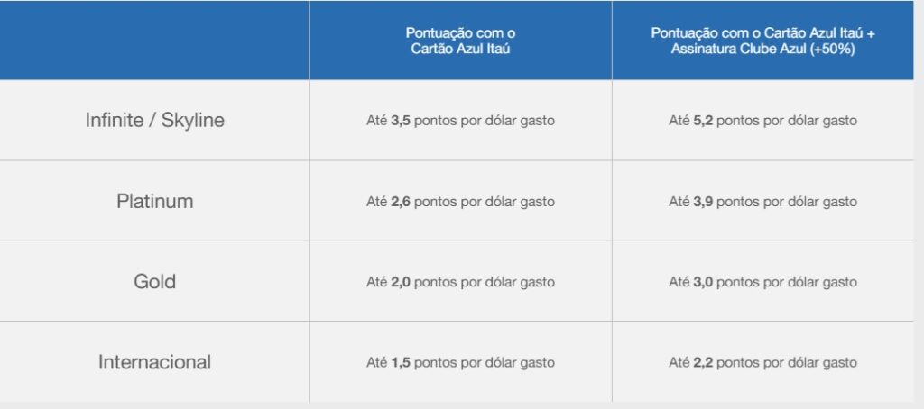 • Cartão Azul Itaú Internacional: 2,1 pontos por dólar gasto em compras e 2,25 pontos por dólar gasto em compras realizadas na Azul.