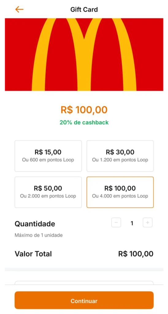 • Cashback de 20% sobre o valor do gift card
