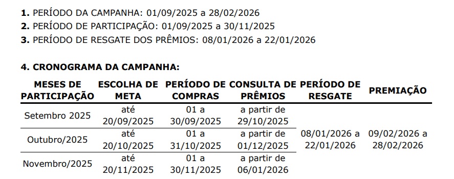 MECÂNICA: Cliente Elegível escolhe a meta de consumo com o(s) Cartão(ões) Participante(s) e, nos meses em que a meta for batida, o Cliente Participante poderá ganhar Prêmio(s), mediante resgate e conforme o disposto neste Regulamento.
