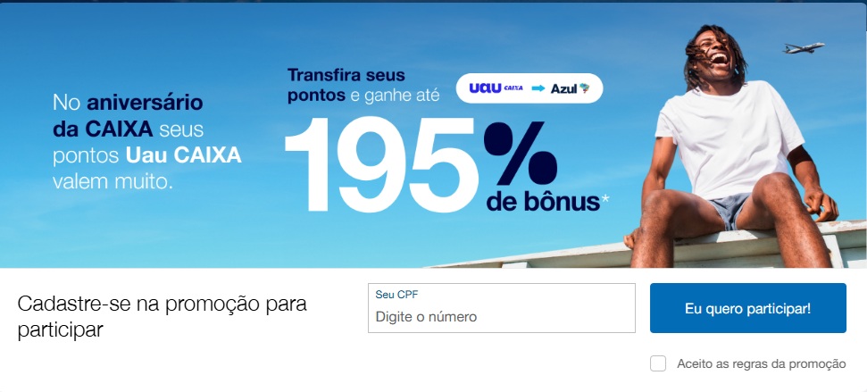 5.1 A 5.1 A Ação consiste na concessão de até 165% (cento e sessenta e cinco por cento) de pontos bônus para os clientes que transferirem pontos UAU Caixa para o programa Azul Fidelidade entre 00h:00 de 12/01/2026 às 23h:59 de 12/01/2026, horário de Brasília. A porcentagem pode ser aumentada dependendo do tempo de adesão ao Clube Azul, conforme itens (item 6) e de acordo com as seguintes premissas:
