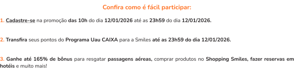 - As milhas bônus serão creditadas em sua conta Smiles até 26/01/2026 e serão válidas por 12 meses.
