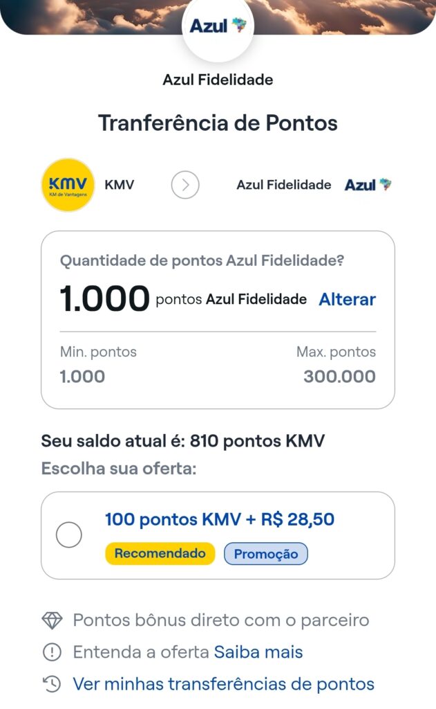 1.1. Os usuários participantes do Km de Vantagens e app KMV, mediante o uso do aplicativo KMV, poderão trocar pontos Azul com desconto mediante a troca de Km de Vantagens acrescido do pagamento de uma taxa de transferência, a qual é variável de acordo com a quantidade de pontos escolhida pelo usuário.