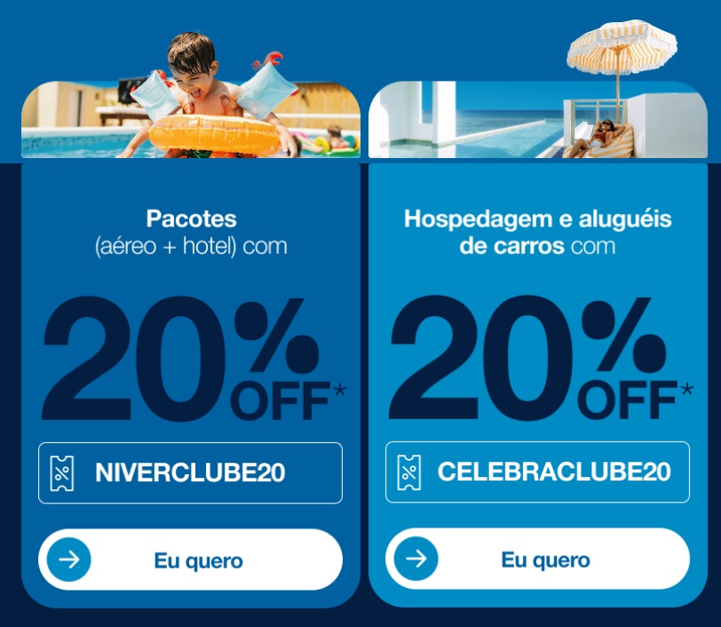 Regras Jurídicas: O código promocional “NIVERCLUBE20”, que concede 20% de desconto em pacotes (aéreo + hotel), é válido para compras de 14/01/2026 a 19/01/2026, ou enquanto durarem os estoques e viagens realizadas entre 15/01/2026 A 14/01/2027. Disponível somente no site Azul Fidelidade (tudoazul.azulviagens.com.br) e em nossa Central de Atendimento (4003-1181). O benefício aplica-se exclusivamente para compras de pacotes (aéreo + hotel). A condição não será aplicável a quaisquer outros produtos ou serviços distintos dos mencionados anteriormente, hotéis vendidos separadamente, aluguel de carros, seguro viagem, ingressos, passeios, cruzeiros, traslados e voos block charter (negociações de transporte aéreo exclusivas de lojas e agências parceiras). A presente campanha promocional poderá ser encerrada a qualquer momento, sem aviso prévio. Os valores, datas e condições de pagamento poderão ser alterados ou reajustados a qualquer momento, também sem aviso prévio. O desconto será concedido apenas para pagamentos realizados em resgate com pontos Azul, por reserva. Em caso de cancelamento ou alteração do produto ou pacote originalmente contratado, o desconto concedido será automaticamente cancelado, aplicando-se, ainda, as penalidades previstas nos Termos e Condições de Prestação de Serviços, disponíveis em http://azulviagens.com.br/termos-e-condicoes. Para informações adicionais sobre condições gerais, regras e restrições específicas das tarifas anunciadas, consulte a Central de Atendimento Azul Viagens (4003-1181), o site www.azulviagens.com.br ou seu agente de viagens. Os descontos não são cumulativos. As imagens utilizadas são meramente ilustrativas.