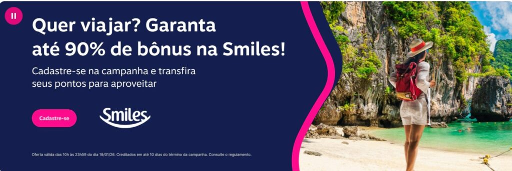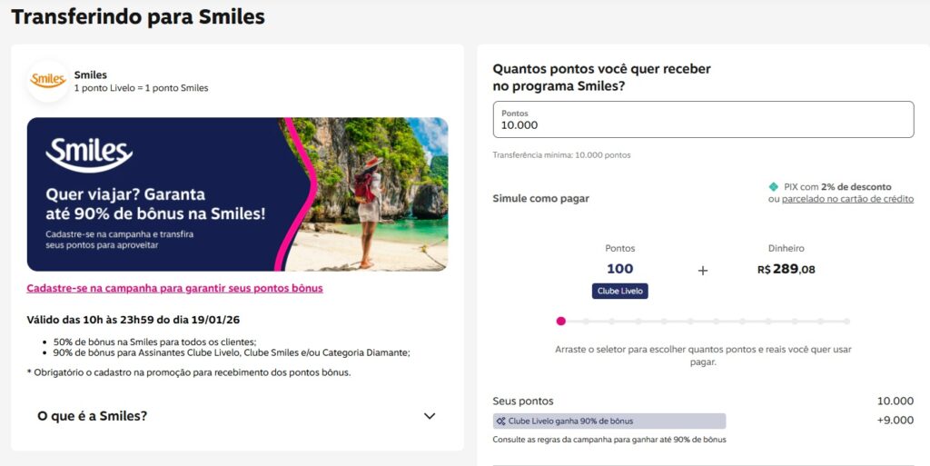 - 90% de bônus para Assinantes Clube Livelo, Clube Smiles e/ou Categoria Diamante;