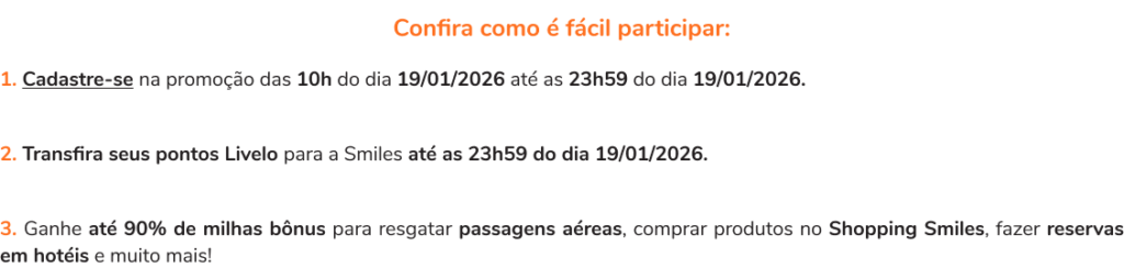 - Para ganhar o bônus correspondente nessa promoção, os clientes assinantes do Clube Smiles e/ou Clube Livelo precisam estar com a assinatura ativa antes de realizar a transferência dos pontos para a Smiles no período da promoção;