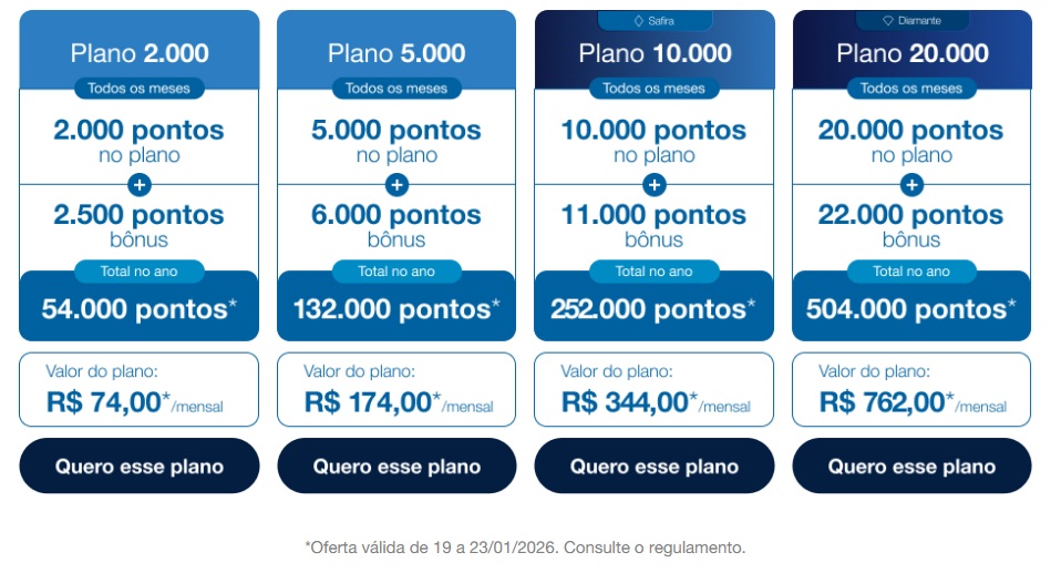 Pontuação bônus: em caso de downgrade antes de completar 6 meses no Plano Atual, os pontos bônus recebidos no período serão cancelados.
